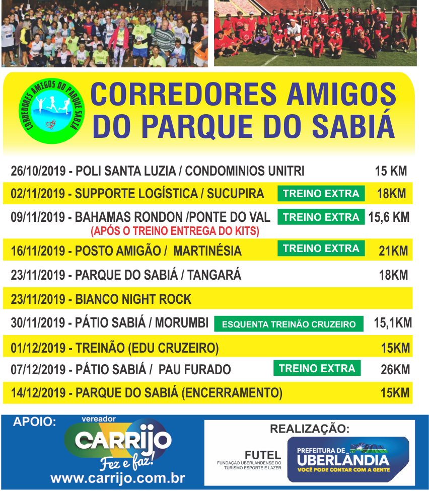 No mês de novembro teremos 4 treinos extra no calendário dos Corredores Amigos do Parque do Sabiá. Os treinos acontecem todos os sábados com início as 7h