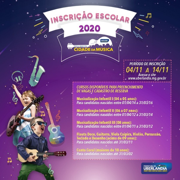 Neste período, também devem ser realizadas as inscrições escolares para a Escola Municipal Cidade da Música. Serão oferecidas vagas nos cursos de Musicalização Infantil (I, II e III), Viola Caipira, Violão, Percussão, Guitarra e Canto Coral. Além disso, será criada uma lista de suplentes para ensino de Flauta Doce, Teclado, e Desenho.