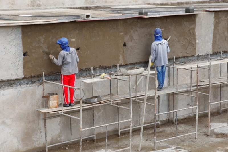 O reboco das paredes da piscina está em fase final. Esse serviço é necessário para regularizar o piso e, assim, iniciar a impermeabilização e a aplicação de revestimento cerâmico. Outra frente de trabalho está assentando os tijolos do corredor de circulação da arquibancada.