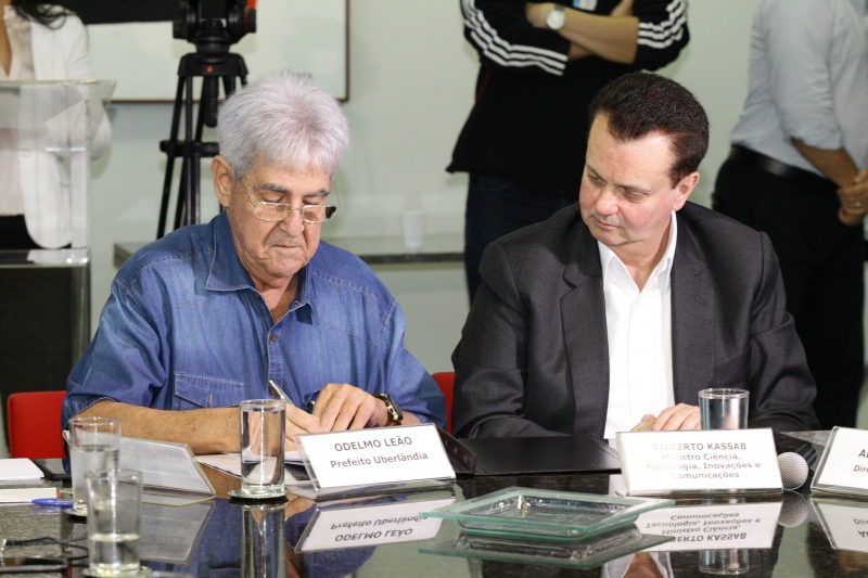 O prefeito Odelmo Leão e o ministro da Ciência, Tecnologia, Inovações e Comunicações, Gilberto Kassab, assinaram, na manhã desta terça-feira (16), um termo de adesão que inclui Uberlândia entre os municípios brasileiros contemplados pelo Internet para Todos. O programa foi criado para levar ou ampliar o acesso à banda larga, com preços abaixo do mercado, para locais que ainda não contam com o serviço. O convênio foi firmado durante evento realizado no Centro Administrativo Municipal para apresentação da iniciativa aos municípios vinculados à Associação dos Municípios da Microrregião do Vale do Paranaíba (Amvap).