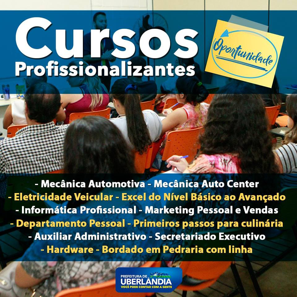 No mês de férias escolares, a Prefeitura de Uberlândia continua a oferecer diversos cursos gratuitos para quem vive na cidade e quer se qualificar. As formações são relacionadas às áreas de tecnologia, gastronomia, mecânica, moda, gestão empresarial e diversos outros segmentos. Interessados podem procurar um dos cinco Centros Profissionalizantes do Município para se inscrever.