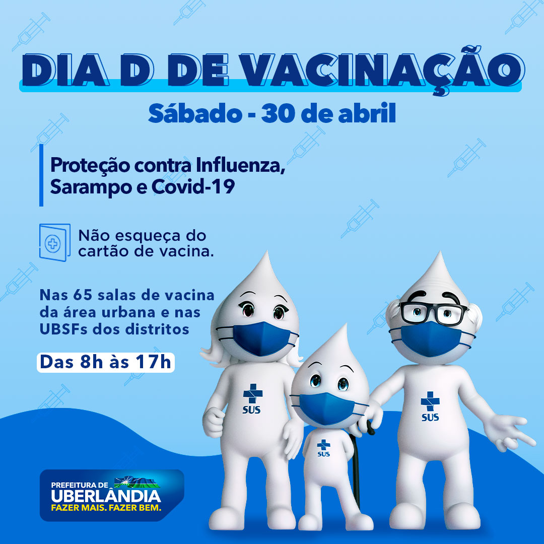 Com o compromisso de garantir a imunização do maior número possível de pessoas consideradas prioritárias na vacinação contra a influenza e o sarampo, a Prefeitura de Uberlândia realiza neste sábado (30) o Dia D. Dessa forma, das 8h às 17h, a população apta a tomar essas vacinas poderá procurar uma das 65 salas de vacina da área urbana do Município e nas Unidades Básicas de Saúde da Família (UBSF) dos distritos.