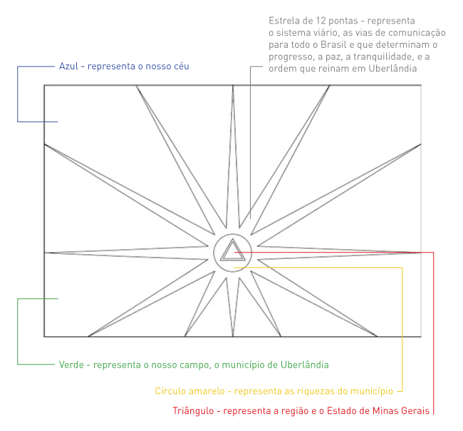 As pontas das estrelas, em número de 12, partem da linha que divide a maior dimensão em duas partes, no sentido horário, formando entre eixos das pontas um ângulo de 30° e com os seguintes comprimentos, 0,80 – 0,92 – 1,04 – 0,90 – 0,80 – 0,46 – 0,40 – 0,46 – 0,80 – 0,90 – 1,04 – 0,92, com o seu interior de branco. As pontas das estrelas, em cor branca representam, além do sistema viário, a paz, a tranquilidade, a ordem que reinam em Uberlândia.