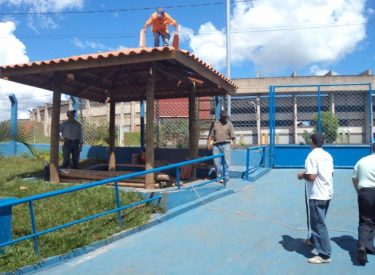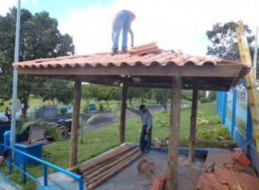 Hoje (30) cobrimos de telha a guarita e agora faremos o acabamento do telhado, a próxima etapa já está em andamento que é o fechamento de madeira das laterais.