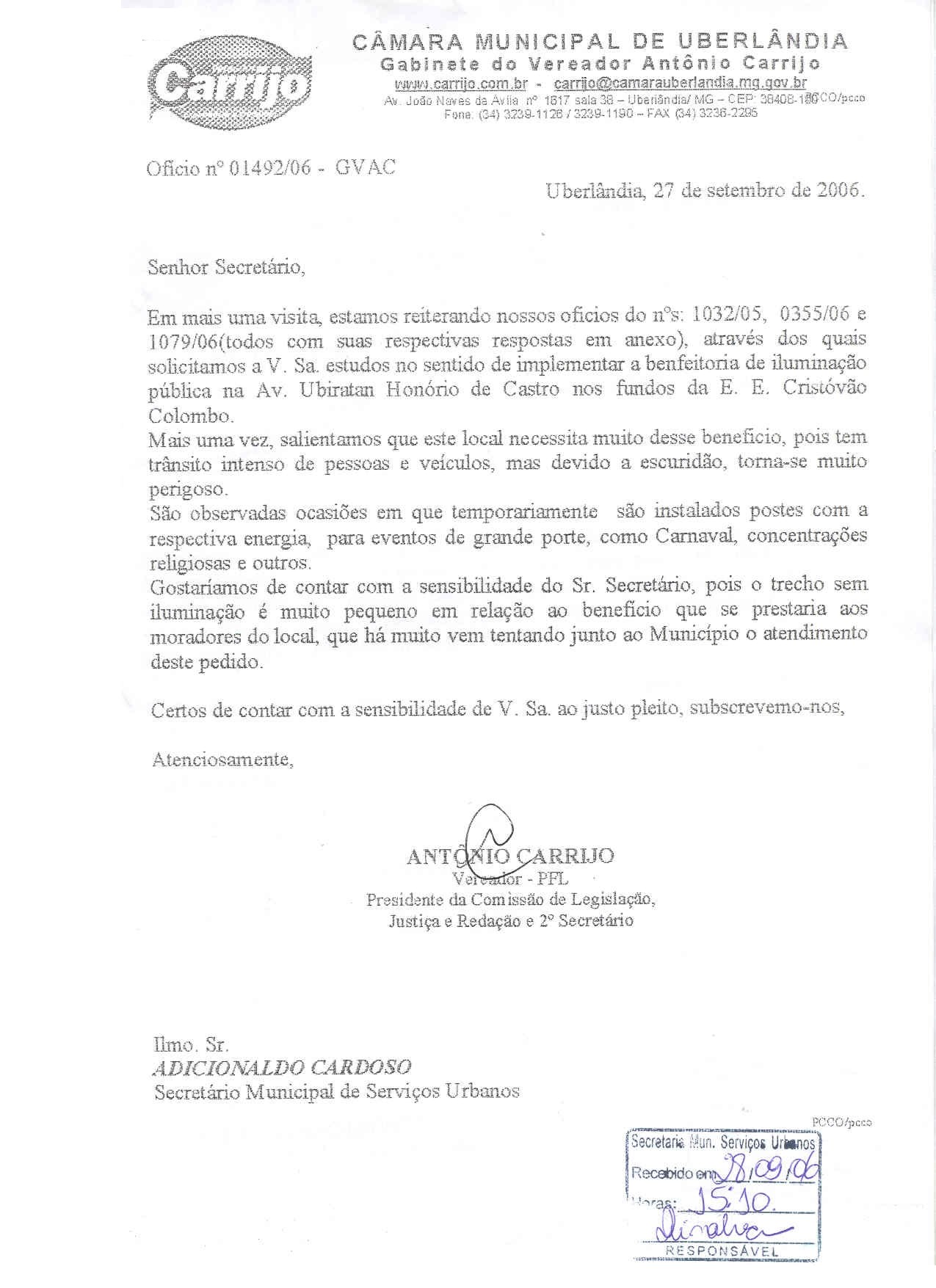Devido ao empenho político do Vereador Carrijo, através dos ofícios nº 0355/06, 1079/06 e 1492/06 a Prefeitura Municipal emitiu ordem de serviços para a Iluminação de Trecho da Av. Ubiratan Honório de Castro, nas imediações da Escola Municipal Cristóvão Colombo.