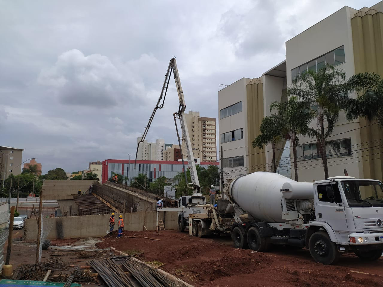 Continuam os trabalhos de concretagem das vigas que darão sustentação ao viaduto da avenida dos Municípios. Nesta terça-feira (19), mais uma estrutura deste tipo foi concretada no local. Para a realização do serviço, três caminhões carregados com concreto são necessários, uma vez que a peça tem 30 metros de comprimento. Está foi a segunda viga e outras 33 do mesmo tipo ainda serão colocadas no viaduto.