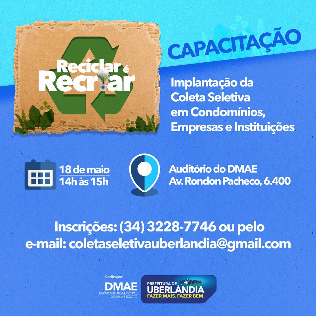 Com o intuito de obter uma maior adesão ao serviço da Coleta Seletiva em Uberlândia, o Departamento Municipal de Água e Esgoto (Dmae) vai realizar, na próxima quarta-feira (18), das 14 às 15 horas, uma capacitação gratuita no auditório da sede (av. Rondon Pacheco, 6400), sobre a implantação do recolhimento de recicláveis em condomínios, empresas e instituições.
