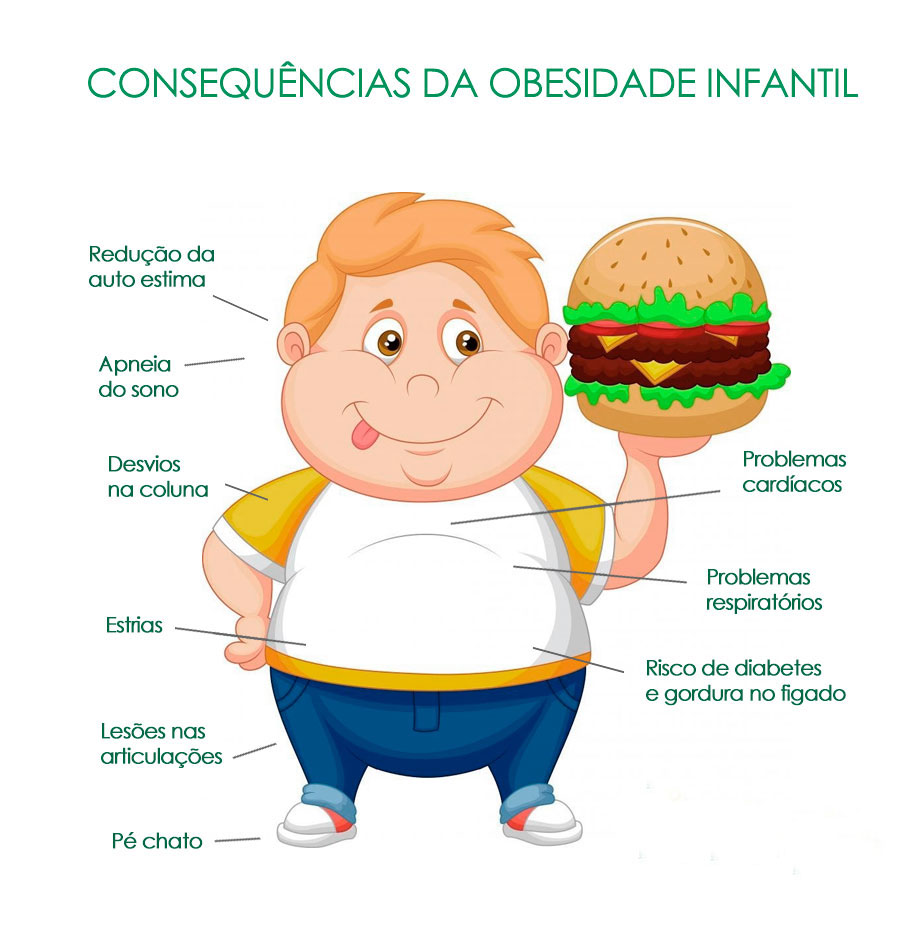 As consequências do excesso de peso na infância vão desde o maior risco de se tornar um adulto obeso, bem como uma maior probabilidade de encarar todos os problemas de saúde que acompanham a obesidade na vida adulta — hipertensão, diabete, acidente vascular cerebral, infarto precoce, alguns tipos de câncer, menor expectativa de vida. Isso sem contar que algumas alterações e complicações podem aparecer na própria infância. É o caso de aumento no colesterol, pressão alta, diabete, problemas ortopédicos, baixa autoestima e até depressão.