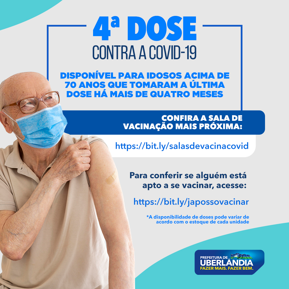 A Secretaria Municipal de Saúde informa que, em cumprimento à deliberação publicada no Diário do Executivo de Minas Gerais no último sábado (2), a aplicação da segunda dose de reforço da vacina contra a Covid-19 começará a ser feita, a partir desta terça-feira (05), em idosos acima dos 70 anos que tomaram há mais de quatro meses a dose de reforço.